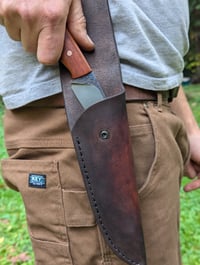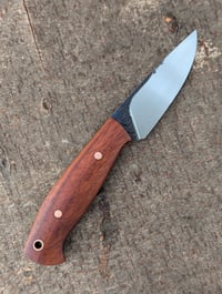 This full-tang bushcraft knife was hand forged from reclaimed spring steel (an old trucks suspension in this case). The handle is possibly Brazilian Cherry (I rescued it from a friend's garage after they moved and I'm not so sure what it is, but it's pretty ain't it?)
